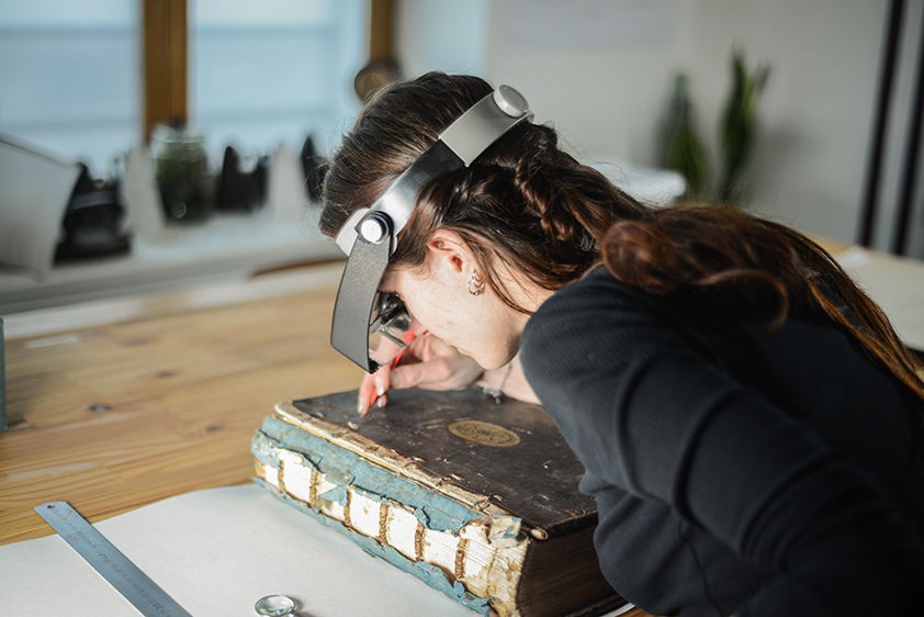 L’atelier Incipit ad Explicit, fondé par Astrid Martin, se spécialise dans la conservation et la restauration d’œuvres graphiques et de livres, qu’ils soient anciens ou modernes. Chaque intervention est personnalisée selon les besoins du document tout en respectant les normes déontologiques de la profession. Astrid a renforcé ses compétences lors d’un stage à la BnF et à l’atelier de restauration de KBR en 2020. Depuis la création de son atelier en novembre 2021, elle travaille pour des particuliers et diverses institutions du Grand Est, traitant un large éventail de documents comme des manuscrits, reliures, affiches, et estampes. Ses interventions incluent la conservation curative, qui stoppe la détérioration, et la conservation préventive, visant à éviter des dommages futurs.