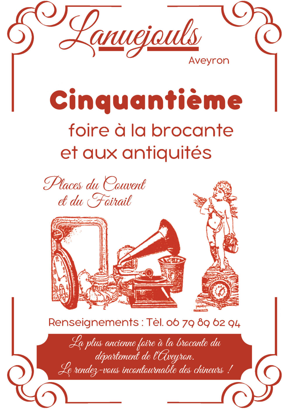 50e Foire à la Brocante et aux Antiquités de Lanuéjouls (12) Foire à la Brocante et aux Antiquités de Lanuéjouls (12) Places du Couvent et du Foirail au Centre-Bourg de Lanuéjouls (12350) Venez à la plus ancienne foire à la brocante de l’Aveyron Organisation : association Vivre à Lanuéjouls – Contact Robert DELMAS Type d'exposants: Exposants professionnels Nombre d'exposants: 75 Ancienneté de la manifestation: 49ème Nombre de visiteurs: 3000 Tarif entrée: Gratuit + Ajouter à mon Agenda Google + iCal / Outlook export Étiquettes : 50e édition, antiquités, aveyron, Centre-Bourg, Couvent, Foirail, Foire à la Brocante, Lanuéjouls Aucun événement trouvé !